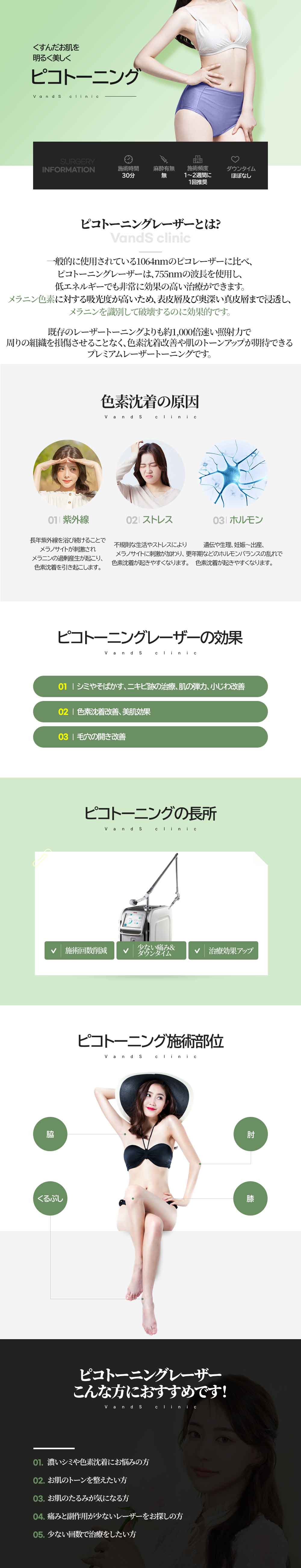 A. ピコトーニングは、既存のレーザートーニング装備の照射速度であるナノセカンド速度であるナノ秒より、 1000倍速い速度でレーザーが照射される装備です。迅速な照査速度で周辺組織の損傷や痛みを最小限に抑える メリットがあります。また、メラニンに反応率の高い波長帯を使用するため、より精密な色素治療ができます。 このようなメリットにより、レーザートーニングと同じ回数で施術した場合、肌のダメージを最小限に 抑えながら、より効果的に色素の改善を確認することができます。